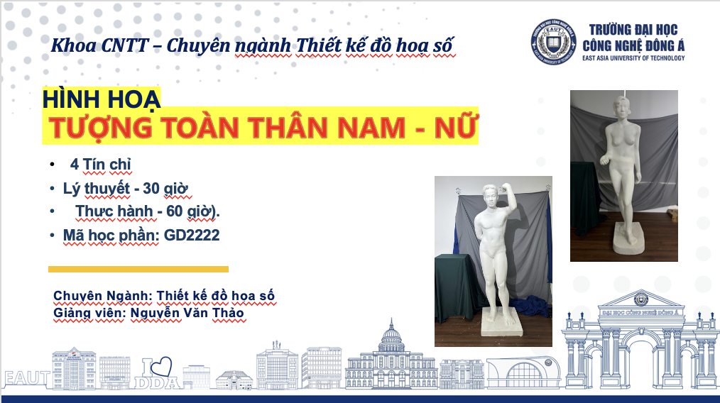 Học phần Hình họa tượng toàn thân (chì đen) cung cấp và giới thiệu với sinh viên đầy đủ những kiến thức về cấu trúc, tỷ lệ cân đối, sự hài hòa của cơ thể người thông qua các dáng mẫu tượng toàn thân nam, nữ; cách quan sát, so sánh, dựng hình dựa trên trục ngang, trục dọc, sử dụng dây dọi và que đo; cách thức xây dựng bố cục một bài hình họa tượng toàn thân; kỹ thuật sử dụng chất liệu chì; kỹ năng diễn tả khối, sáng tối, đậm nhạt, không gian trong vẽ nghiên cứu hình họa tượng toàn thân. Sau khi học xong học phần này, sinh viên sẽ được trang bị những kiến thức về cấu trúc cơ thể, người hoàn thiện thông qua mẫu tượng thạch cao; các thủ pháp nghiên cứu hình họa, những phương pháp và kỹ năng diễn tả sáng tối, đậm nhạt, chất liệu thạch cao.