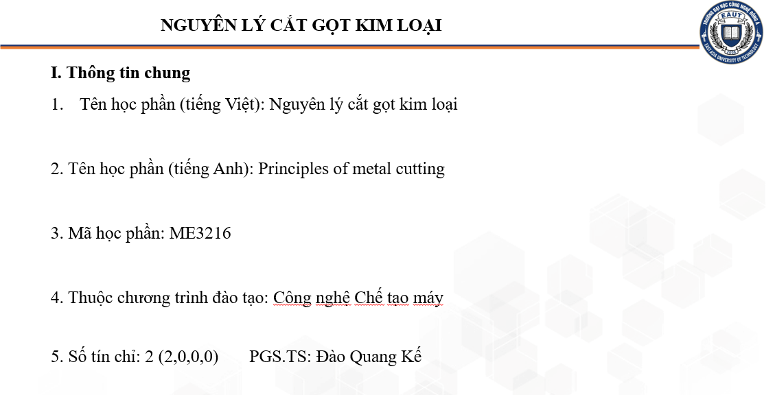 - Hiểu và trình bày được về nguyên lý cắt gọt kim loại để nắm được các hiện tượng vật lý cơ bản sinh ra trong quá trình cắt
