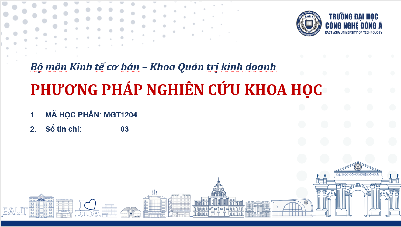 Học phần Phương pháp Nghiên cứu khoa học là học phần thuộc khối kiến thức giáo dục đại cương. Học phần trang bị cho sinh viên các kiến thức cơ bản về phương pháp nghiên cứu khoa học từ tổng quan nghiên cứu khoa học đến phát hiện vấn đề, thiết kế nghiên cứu, mẫu, phân tích, trình bày kết quả và viết báo cáo nghiên cứu. Sau khi học xong học phần này người học có khả năng hiểu và vận dụng các phương pháp nghiên cứu vào học tập và nghiên cứu trong giải quyết các vấn đề nghiên cứu kinh tế xã hội và quản trị kinh doanh.