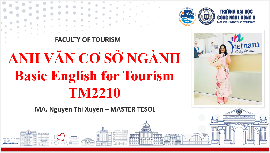 Học phần Anh văn cơ sở ngành là học phần thuộc khối kiến thức ngoại ngữ chuyên ngành Quản trị dịch vụ, du lịch và lữ hành. Học phần trang bị cho sinh viên lượng từ vựng, cấu trúc ngữ pháp và kiến thức phát âm cơ bản giúp sinh viên tự tin hơn trong giao tiếp bằng Tiếng Anh trong lĩnh vực du lịch. Mỗi bài học bao gồm: Đọc hiểu, nghe hiểu, từ vựng, ngữ pháp, phát âm, tình huống thực tế trong nghề nghiệp. Sau khi học xong học phần này người học có khả năng giao tiếp bằng tiếng Anh giao tiếp cơ bản trong lĩnh vực du lịch qua một số chủ điểm chuyên ngành. Người học cũng sẽ có kĩ năng giao tiếp tốt với khách hàng qua các tình huống ứng xử bằng tiếng Anh. Điều này giúp cho sinh viên có nhiều cơ hội phát triển trong lĩnh vực du lịch.