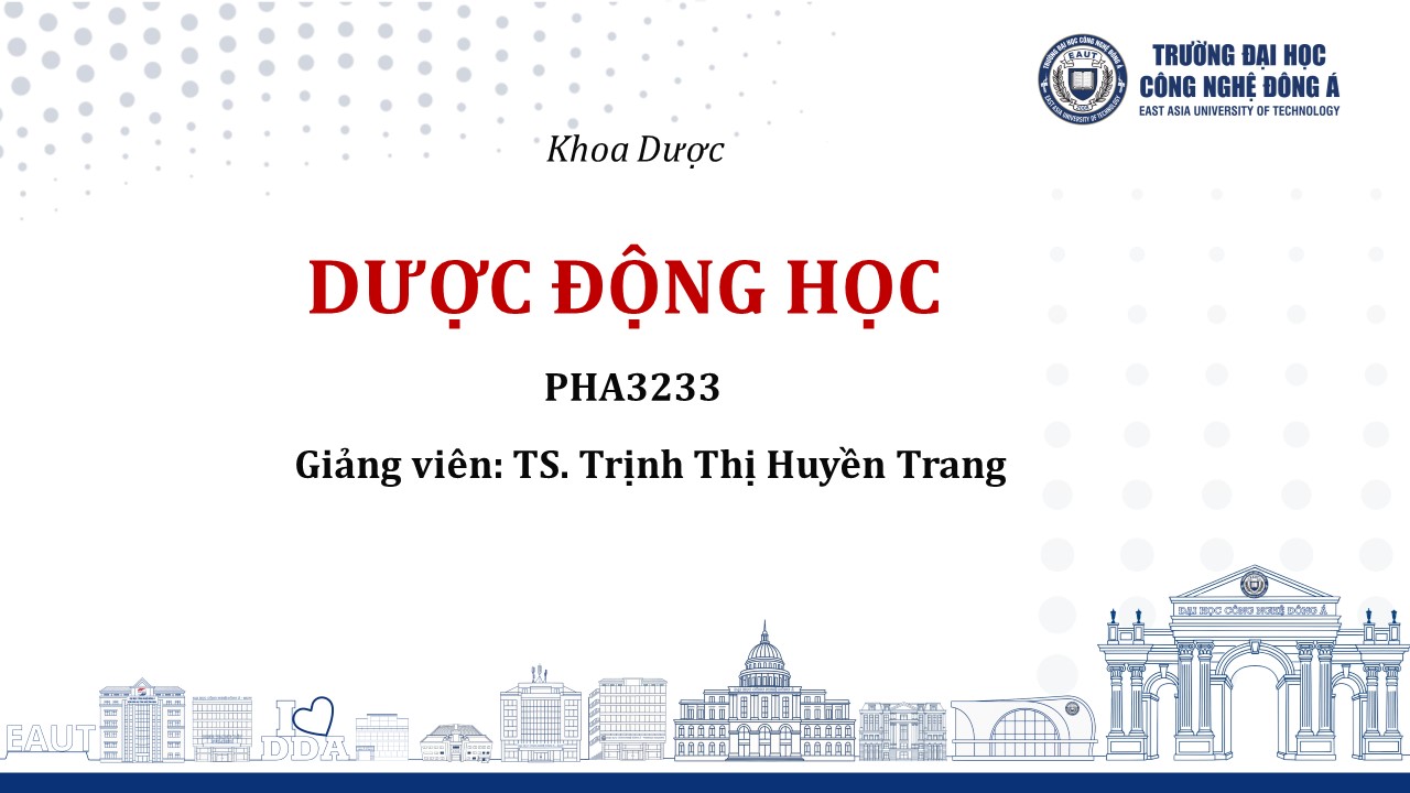 Học phần Dược động học là học phần thuộc khối kiến thức chuyên ngành Dược. Học phần mô tả những kiến thức chung về quá trình vận chuyển thuốc trong cơ thể và các cơ chế thường gặp trong vận chuyển thuốc qua màng; các quá trình hấp thu- phân bố- chuyển hóa- thải trừ thuốc trên người trưởng thành khỏe mạnh và trên các đối tượng đặc biệt: trẻ em, người cao tuổi, phụ nữ có thai; Các thông số dược động học cơ bản (F, Vd, Cl, T1/2) đặc trưng cho mỗi giai đoạn trong chu trình tuần hoàn thuốc trong cơ thể; sự biến đổi các thông số dược động học cơ bản (AUC, Vd, Cl, T1/2) ở bệnh nhân suy gan- thận, các nguyên tắc lựa chọn thuốc và hiệu chỉnh liều cho bệnh nhân suy gan- thận.