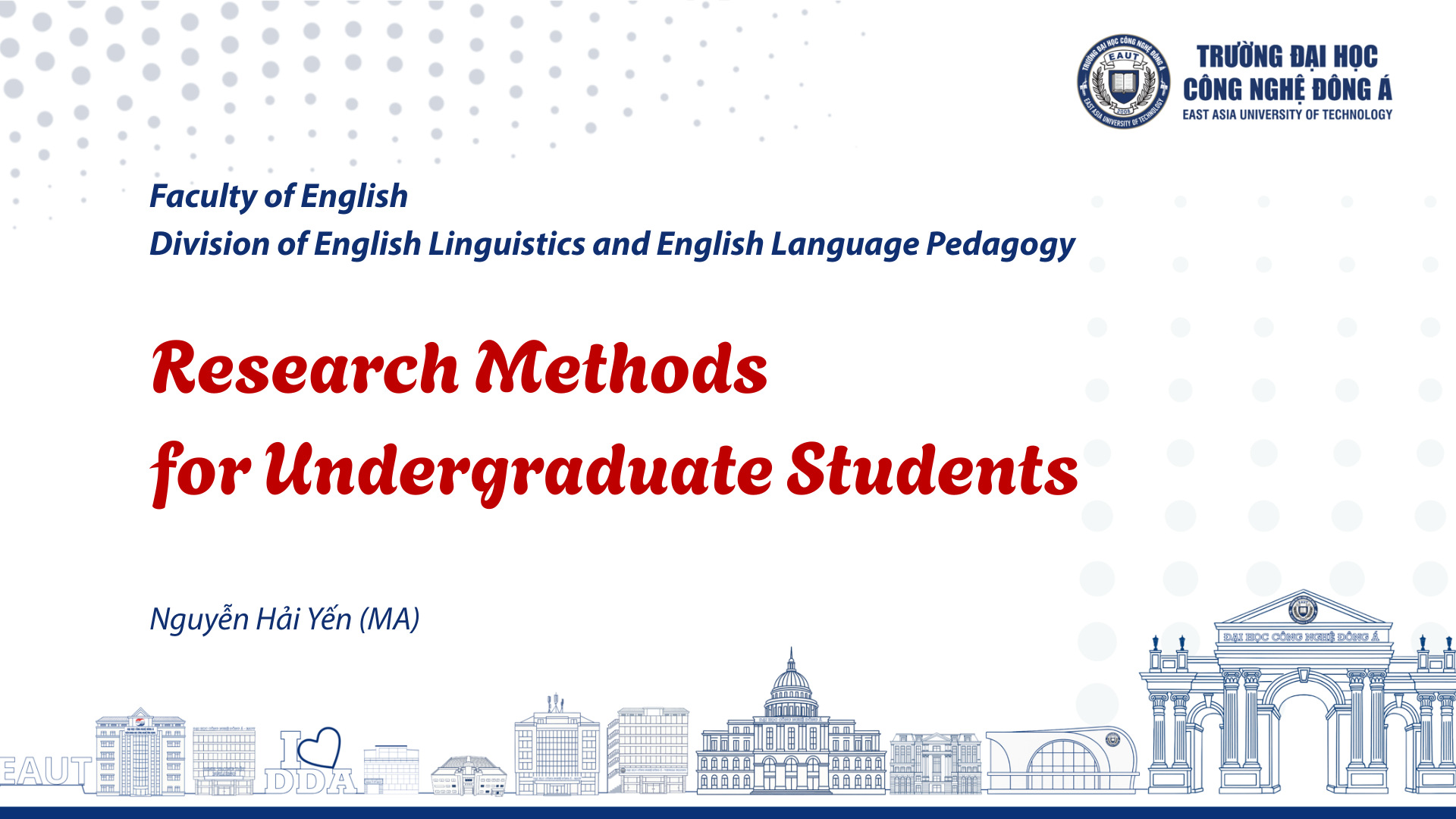 Học phần Phương pháp nghiên cứu khoa học thuộc khối kiến thức cơ sở ngành giảng dạy tiếng Anh, cung cấp nền tảng về quy trình nghiên cứu từ khái niệm cơ bản đến cách thực hiện và viết báo cáo. Sinh viên được học quy trình thực hiện đề tài nghiên cứu, cách xây dựng vấn đề, đặt câu hỏi nghiên cứu, lựa chọn hướng tiếp cận và xây dựng công cụ thu thập và phân tích dữ liệu định lượng, định tính để đảm bảo tính xác thực và độ tin cậy của kết quả nghiên cứu cũng như liêm chính khoa học.